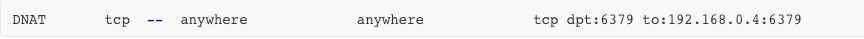 上述规则会将从任意源发送到当前机器 6379 端口的 TCP 包转发到 192.168.0.4:6379 所在的地址上。